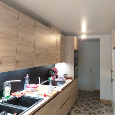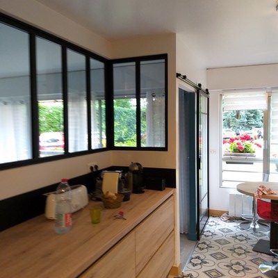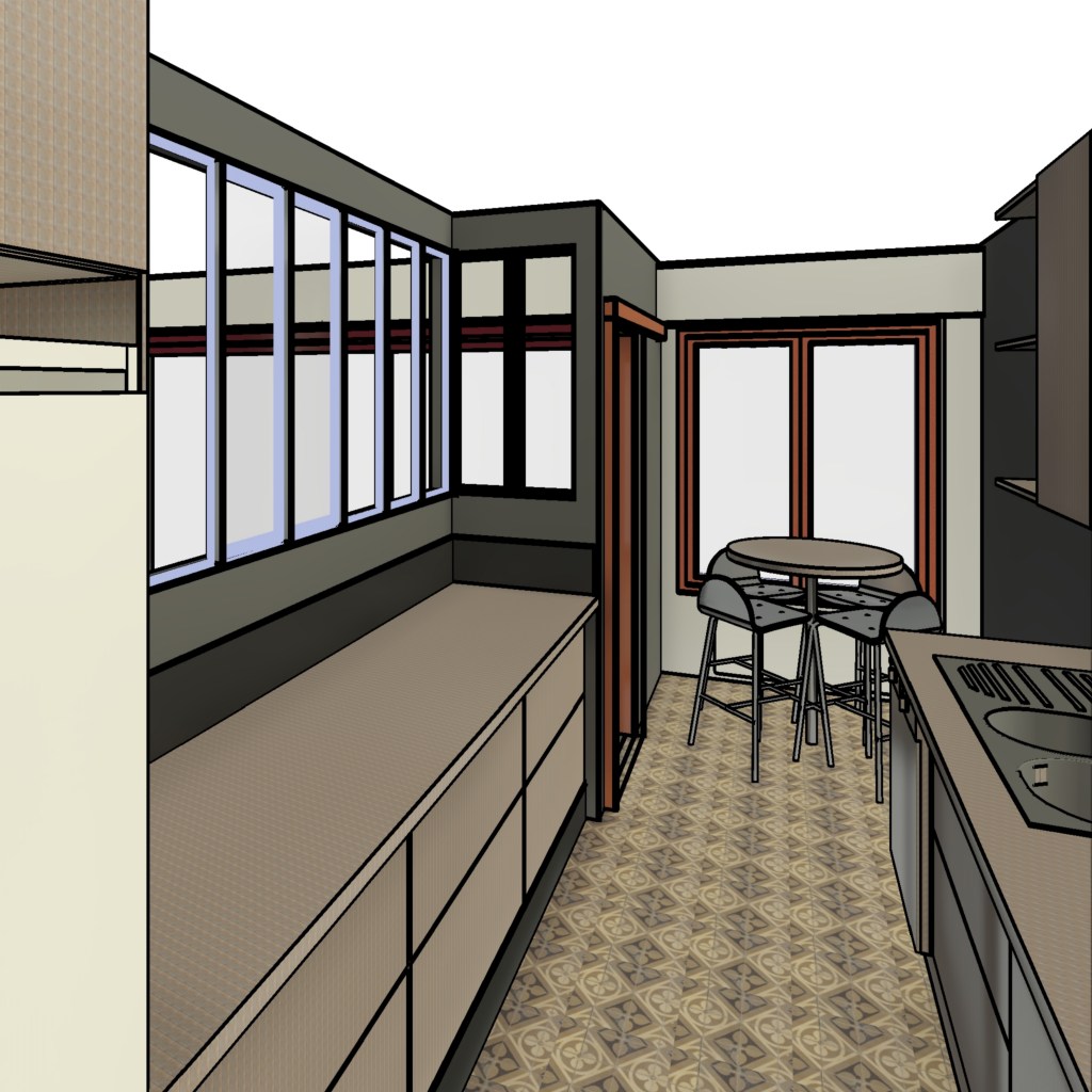 Rééquilibrer un logement de 5 pièces au rdc avec loggia, avec une vue sur un vaste espace boisé, mais une minuscule cuisine « hors échelle ». Ce travail de conception sur la cuisine a été essentiel : quitter ce format de boyau, étroit et linéaire, pour permettre de « se croiser », ramener de la lumière avec une verrière, tout en créant un lien fort avec le séjour et la salle à manger.