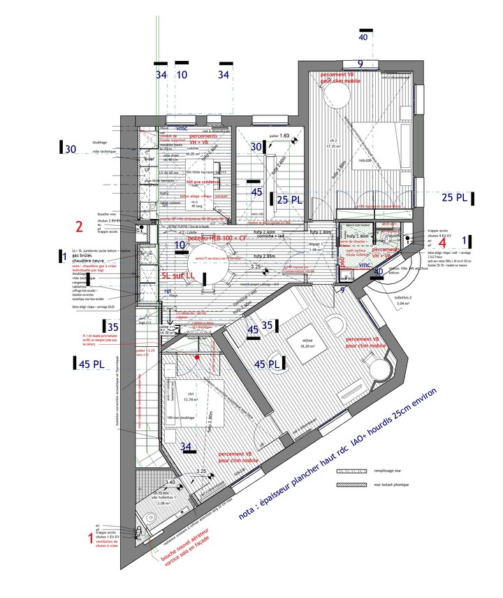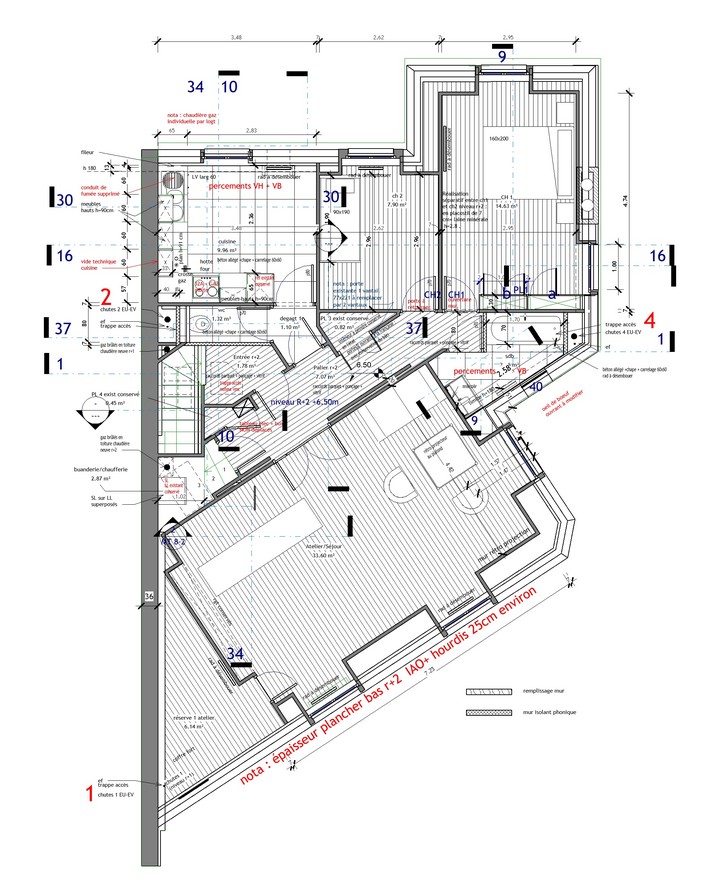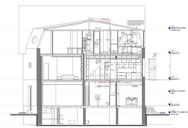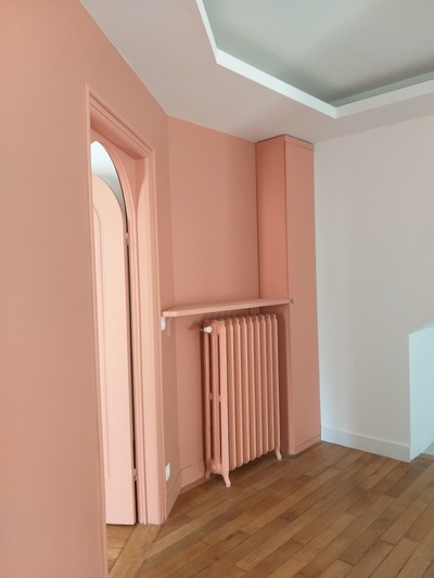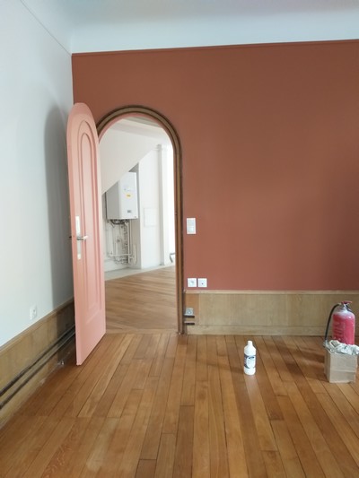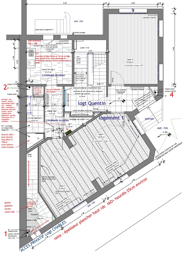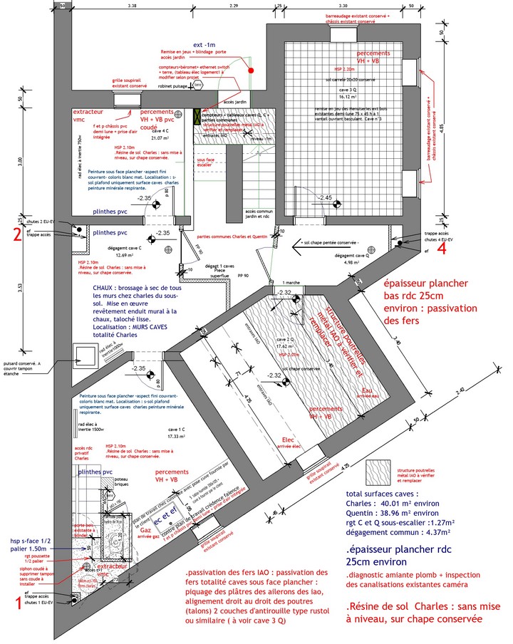 Le chauffage collectif au fioul, dans la cave est supprimé : il s’agit de permettre à chacun des 3 logements d’être autonome : par l’accès, par les parties communes , et le chauffage au gaz, devenu individuel. Il a été réalisé une passivation des fers de structure du plancher haut du sous-sol. Les logements des r+1 et r+2 ont été remaniés -ouverture au r+1, dans un mur de refend avec étude de structure par un ingénieur : un usage et des proportions retravaillées afin de s’adapter à la nouvelle décennie.