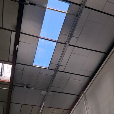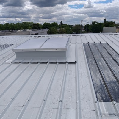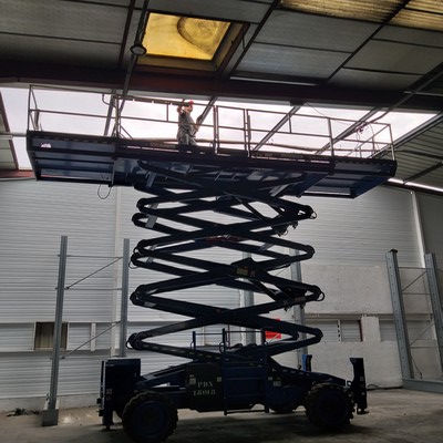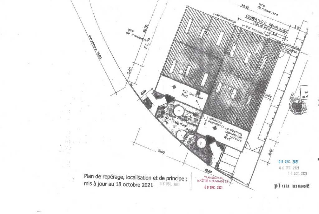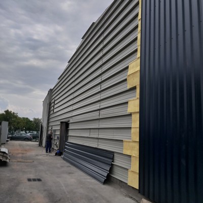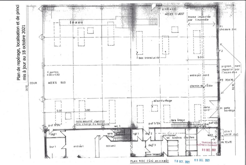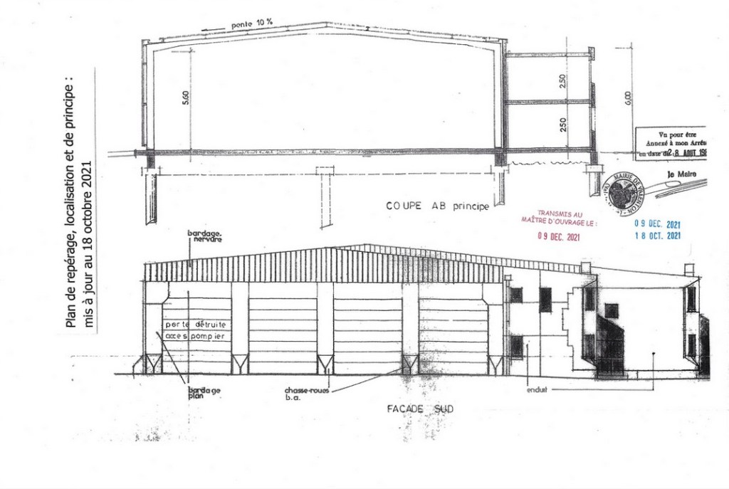 .Charpente métallique, couverture bacs aciers, chéneaux, descentes EP, remplacement de 14 pannes IPE 100 (pour mémoire : la structure métallique -portique- n’est pas déformée) , isolation, lanterneaux désenfumage, bardage, menuiseries extérieures, réfection des toits terrasse, et clôture.