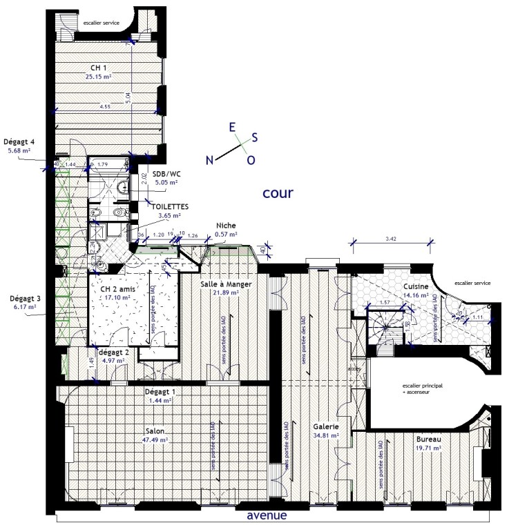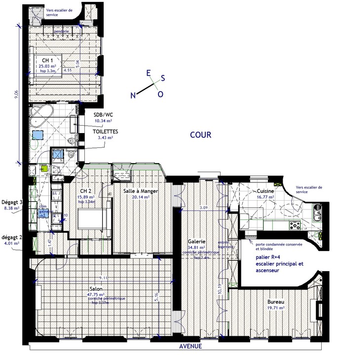 -Ce logement est desservi par son escalier principal, avec ascenseur, et 2 escaliers de service sur cour.