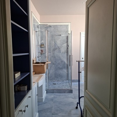 -L’accès au dégagement se fait par le salon. Le couloir est réduit afin de proposer une sde généreuse, en commandant l’accès à la chambre principale, côté cour.